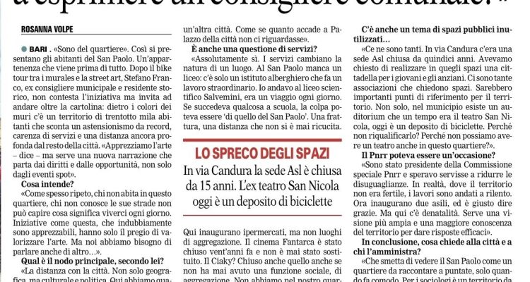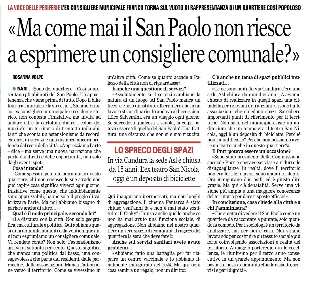 L’edizione del 4 marzo 2026 della Gazzetta del Mezzogiorno ha dedicato spazio alla discussione nata da un mio post sui social (ne parlavo anche qualche giorno fa) che poneva una domanda semplice: perché un quartiere di oltre 40.000 abitanti non riesce a esprimere un consigliere comunale da oltre venticinque anni?